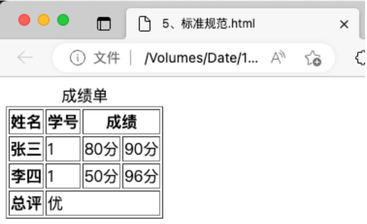 <caption>学生成绩单</caption>