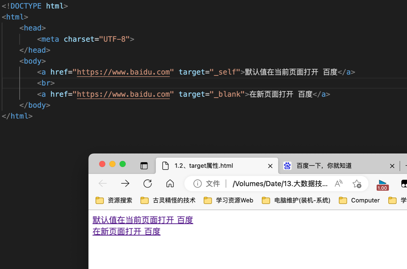 <a href="https://www.baidu.com" target="_self">默认值在当前页面打开 百度</a>