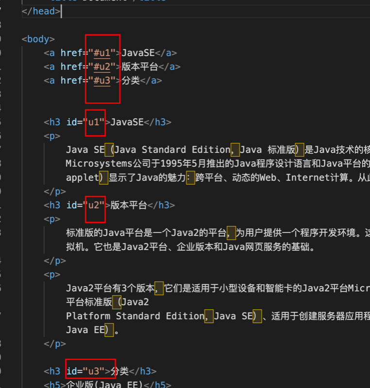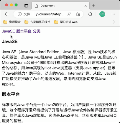 如百度百科介绍JavaSE的目录,用于快速定位当前页面的某一块,实线如下效果