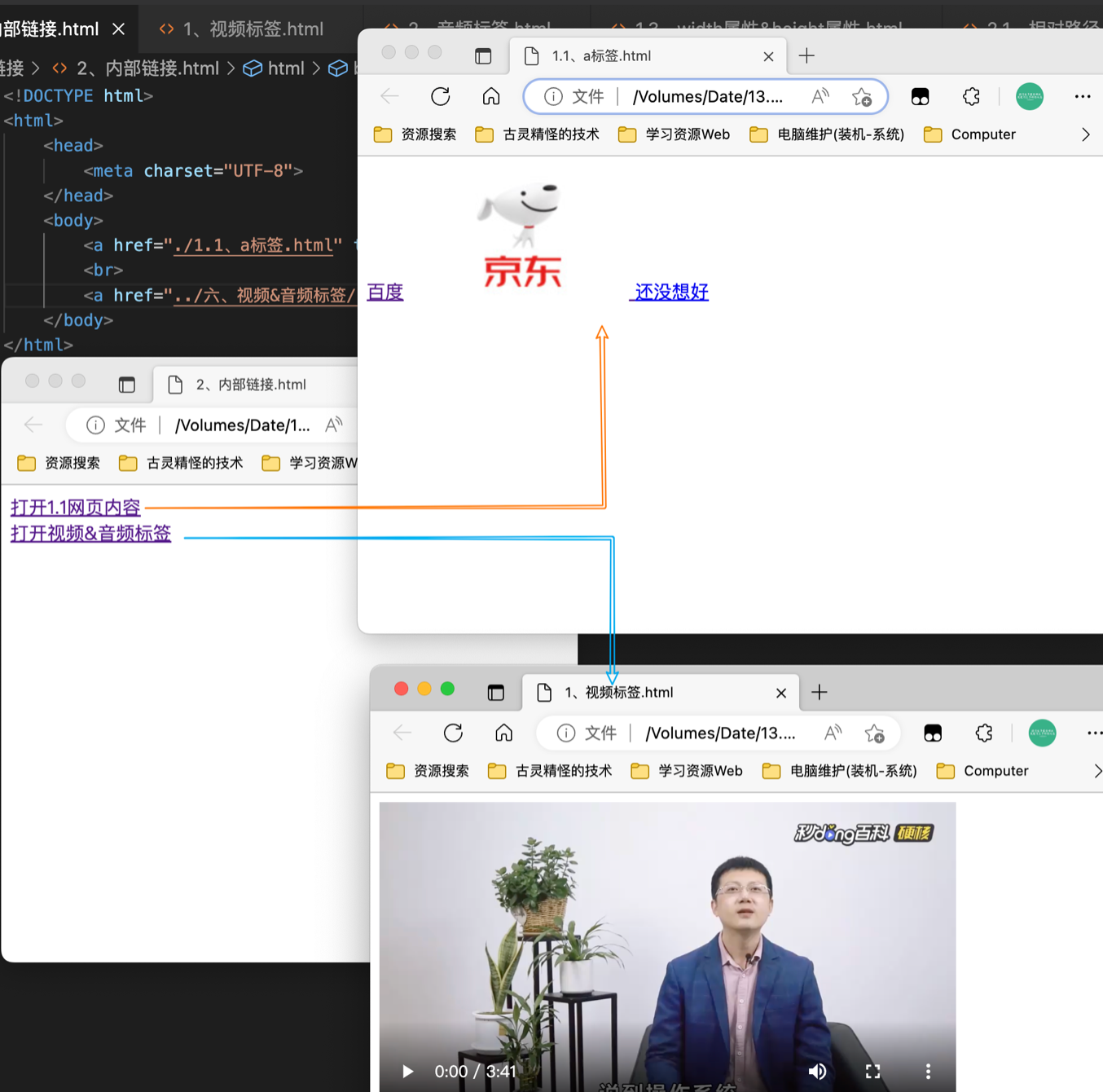 上面所介绍的是外部链接,接下来介绍内部链接,在开发中,一个网站通常会有许许多多的网页构成,在网页之间来回切换就需要用到内部链接了。