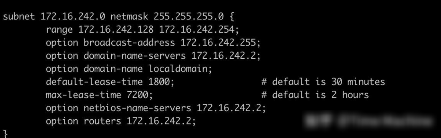 - less dhcpd.conf 查看 dhcpd.conf。其中的 range 代表虚拟机允许选择的惊静态 ip 地址范围,我这里的范围就是 172.16.242.128 ~ 172.16.242.254
