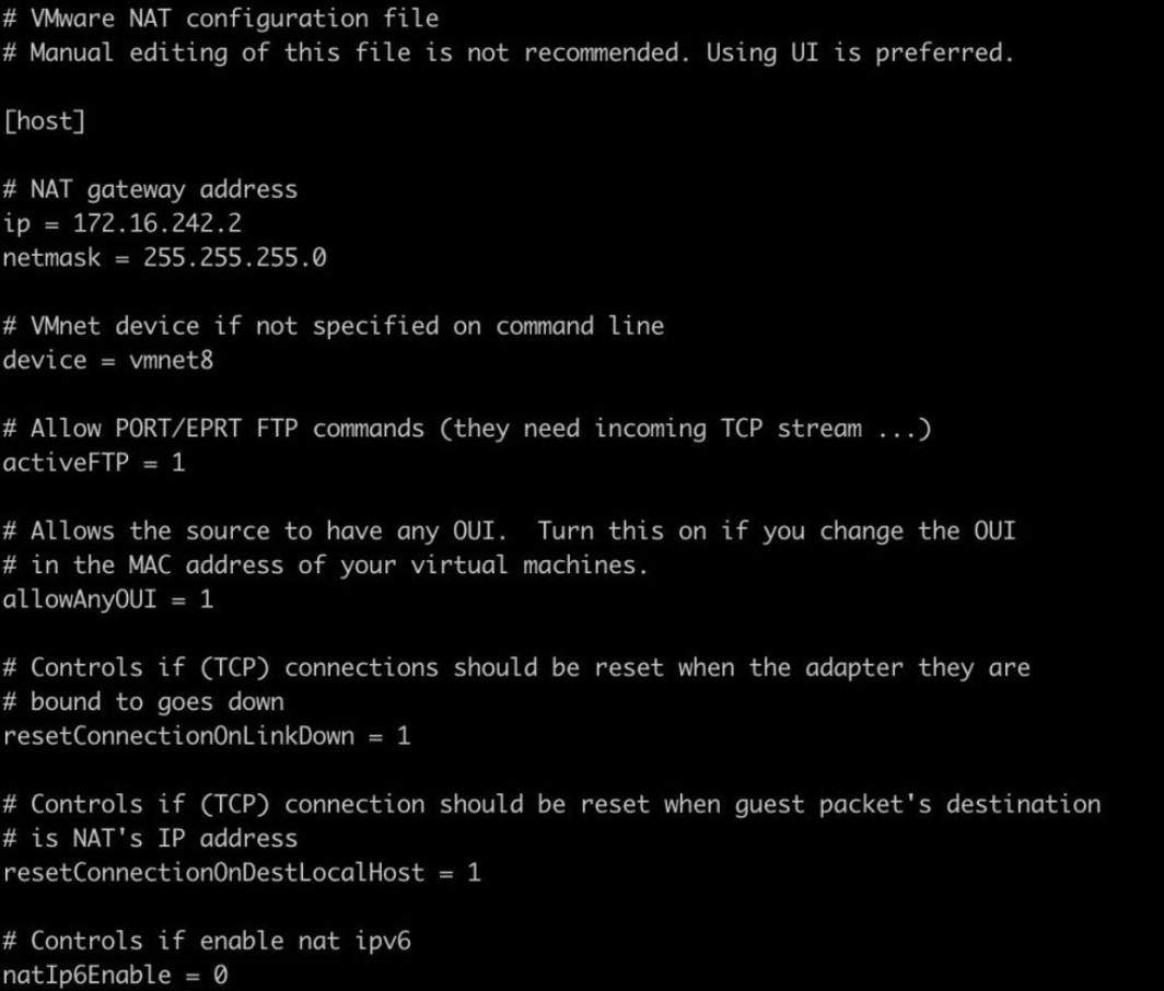 - 进入 Vmaware Fusion 的 vmnet8 目录, sh cd /Library/Preferences/VMware\ Fusion/vmnet8less nat.conf 查看 nat.conf。其中的 NET gateway address 中的 ip 就是本机网关地址,netmask 是子网掩码。